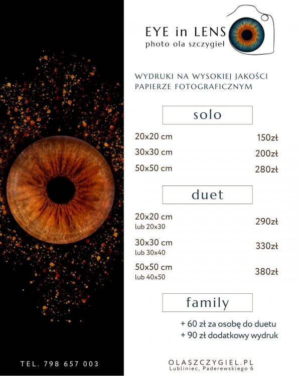 Artystyczne projekty oparte o zdjęcia Twojego oka. Wykonywane przez fotografkę przy użyciu obiektywu do makrofotografii a następnie poddane obróbce i wydrukowane na wysokiej jakości papierze fotograficznym. Zajrzyj w fascynujący makro świat z moją pomocą!